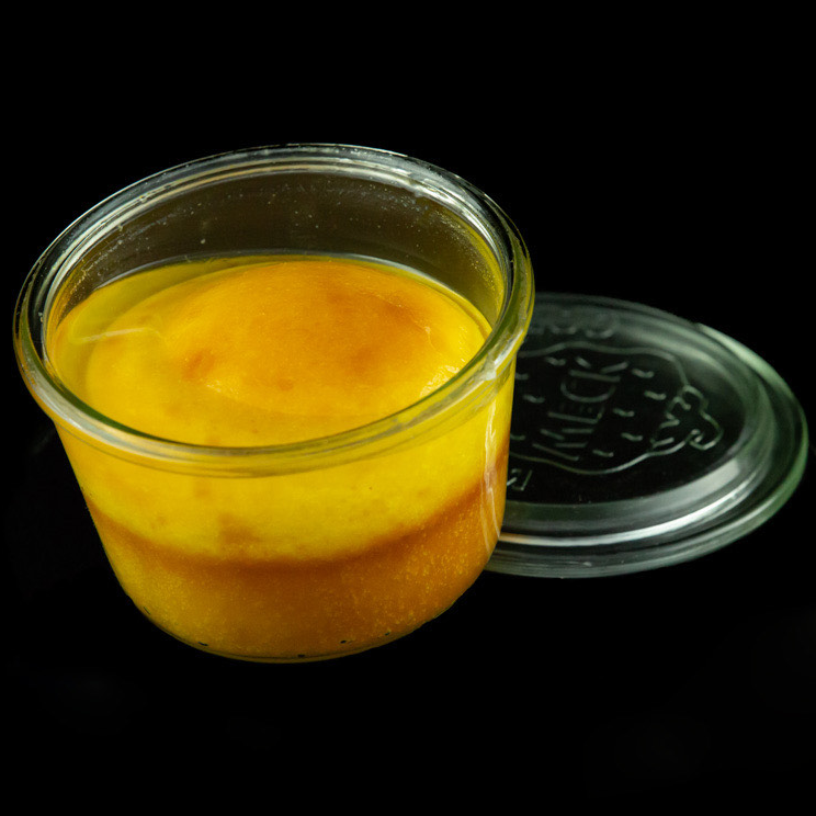 Fondo di frolla, mele in cubetti, Royale – uovo, panna, zucchero integrale di canna – crumble di pasta di mandorle e frolla.